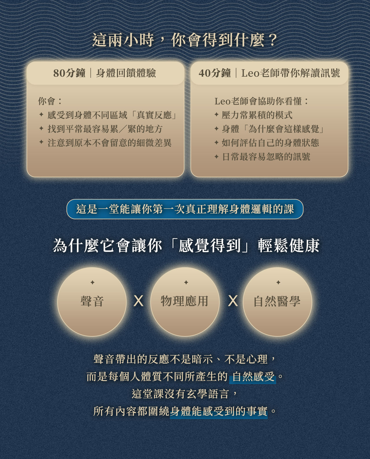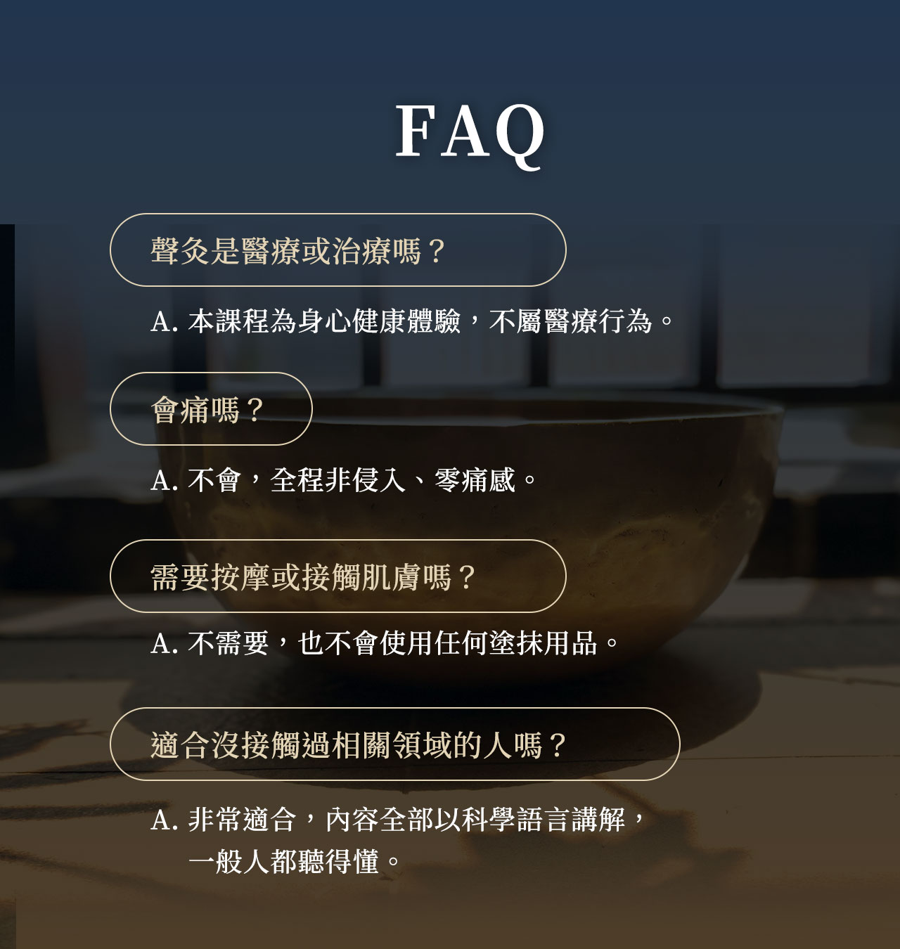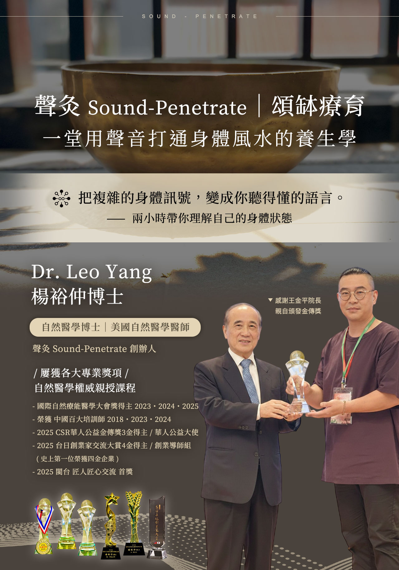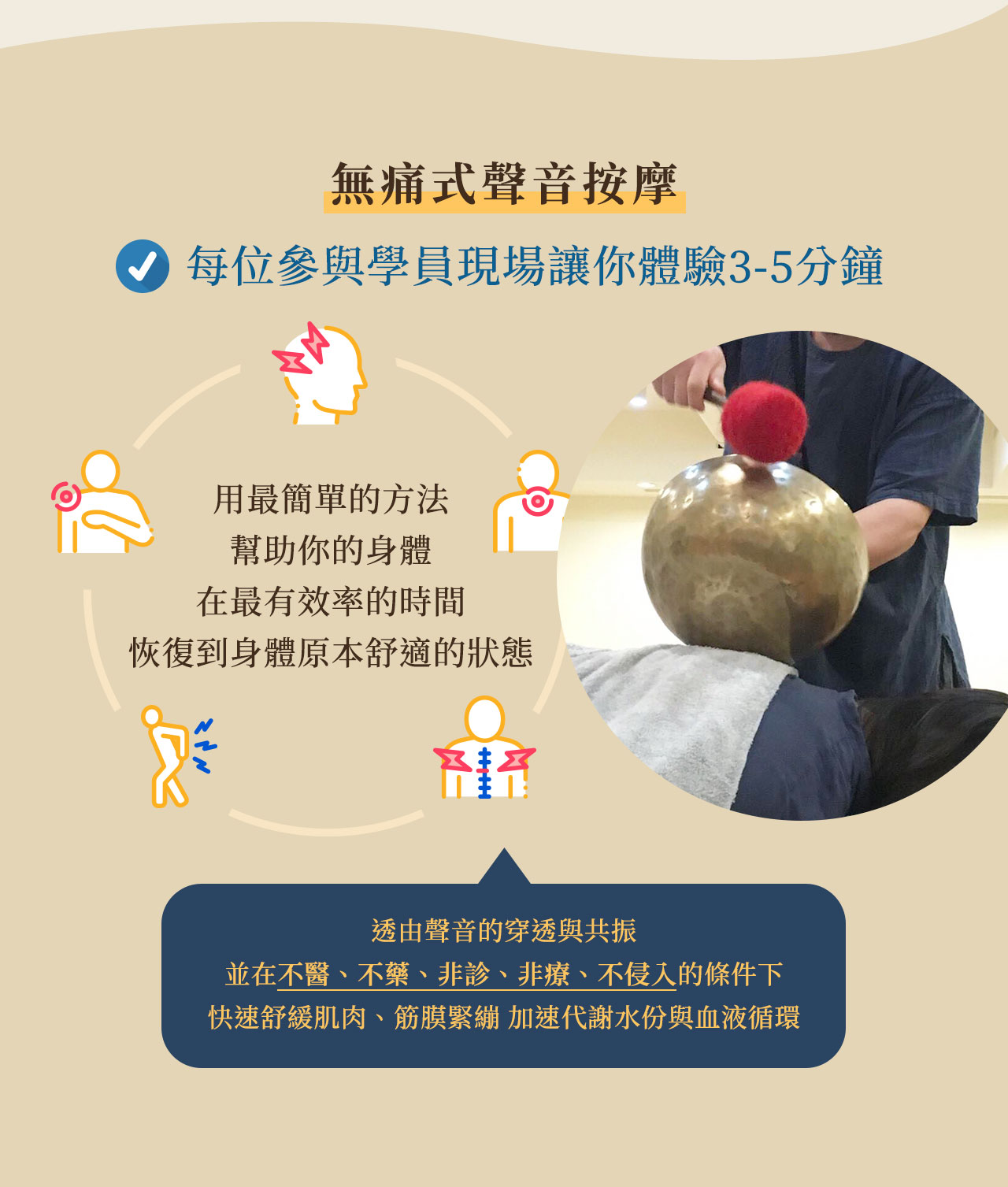 本課程將帶 你/妳 體驗聲音的力量,如何有效地運用在自己、親友、及最愛的家人身上,你/妳 將有系統地學習「聲灸」療育系統的運作原理,真實體驗一堂「用聲音打通身體風水的養生學」