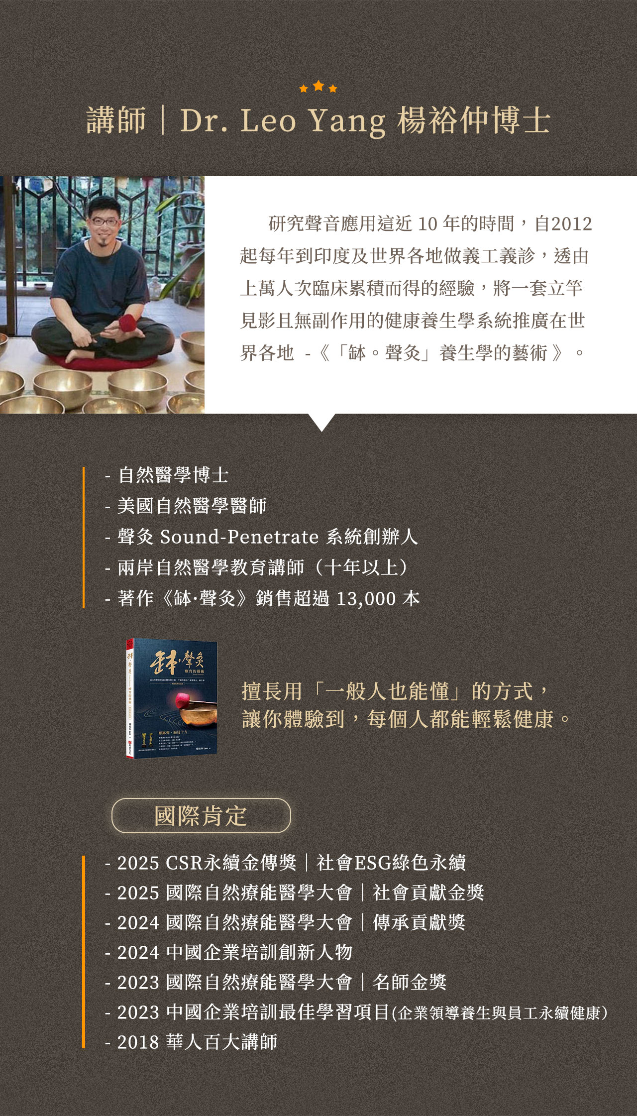 你好,我是頌缽養生學《聲灸》課程創辦人Leo,本身是金融專業經理人。